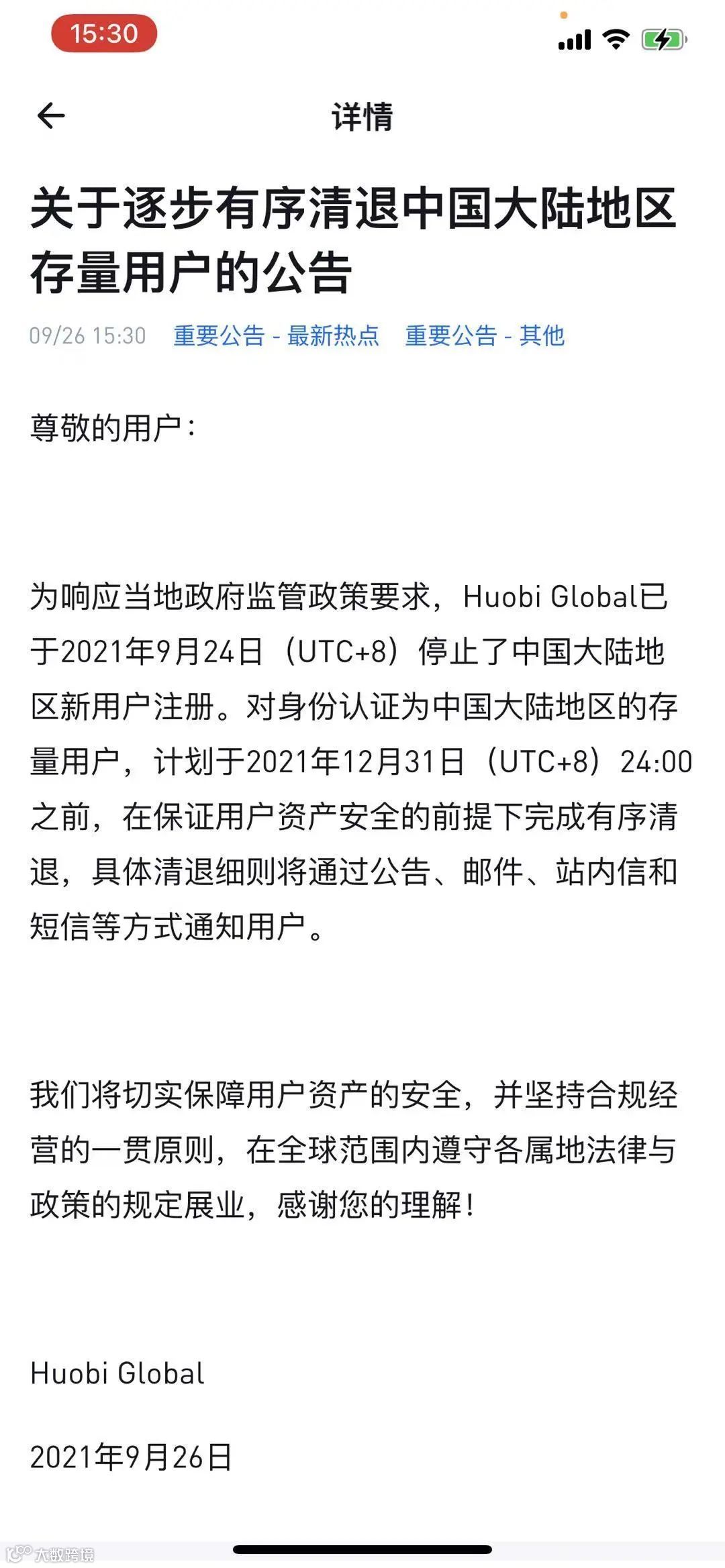 9月26日下午,火币全球站发布公告称,为响应相关监管要求,火币全球站已于2021年9月24日停止了中国大陆地区新用户注册。对身份认证为中国大陆地区的存量用户,计划于2021年12月31日24:00之前,在保证用户资产安全的前提下完成有序清退,具体清退细则将通过公告、邮件、站内信和短信等方式通知用户。