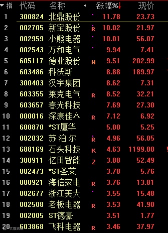 家电股午后继续走强,新宝股份、小熊电器等多股涨停,科沃斯一度触板,石头科技、老板电器、九阳股份等跟随拉升。