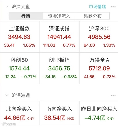 截至收盘,沪指涨1.05%报3494.63点,深成指涨0.77%报14941.44点,创业板指跌0.98%报3456.75点。两市合计成交12490亿元,北向资金净流入44.66亿元。