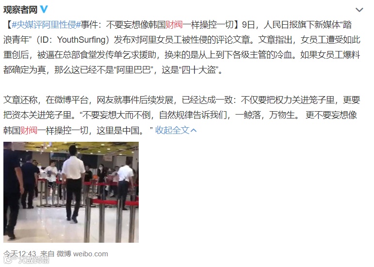另外,《人民日报》旗下“踏浪青年”评阿里巴巴性侵事件表示:1、不仅要把权力关进笼子里,更要把资本关进笼子里。2、从蒋凡事件开始,国家态度已经非常明确,资本绝不能控制媒体。3、不要妄想大而不倒,自然规律告诉我们,一鲸落,万物生。4、更不要妄想像韩国财阀一样操控一切,这里是中国。