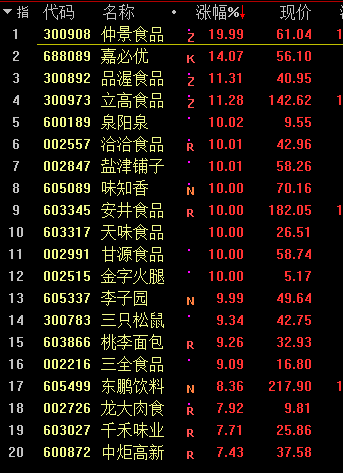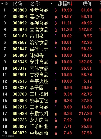 食品饮料板块午后掀涨停潮,仲景食品、盐津铺子、洽洽食品、味知香、天味食品、李子园等十余股涨停,千禾味业、东鹏饮料、桃李面包、涪陵榨菜、海天味业等集体冲高。