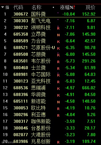 半导体板今日盘中大幅下挫,截至收盘,国科微跌逾10%,立昂微跌超7%,芯朋微、芯原股份跌逾6%
