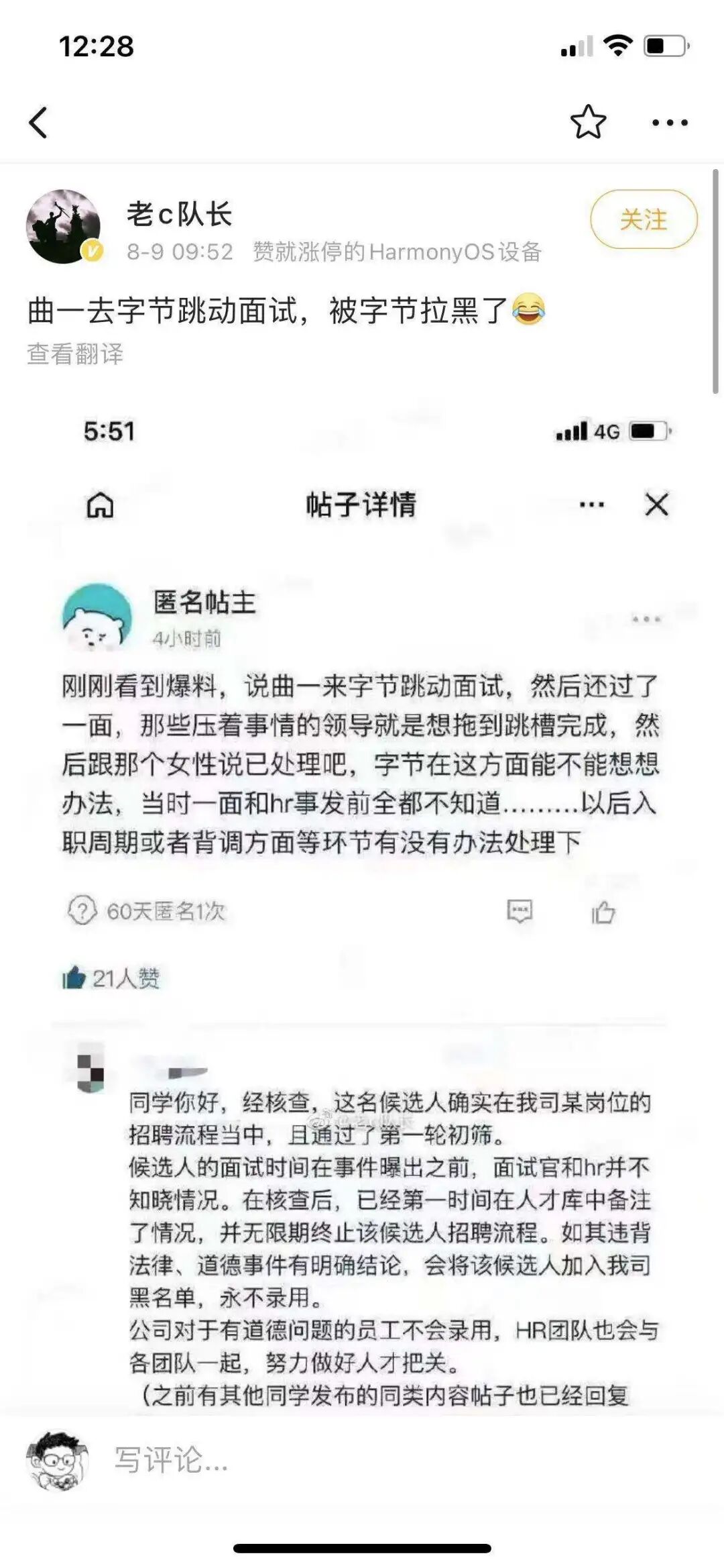 字节跳动HR表示,如其违背法律、道德事件有明确结论,会将该候选人加入黑名单,永不录用。