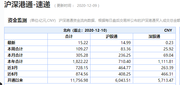 Wind数据显示,截至12月10日,北向资金净流入达到305.28亿元,远远高于全年月平均水平。数据上看,近6月,北上资金仅仅流入874.56亿元,但是近3月流入的总额就达到了728.15亿元。