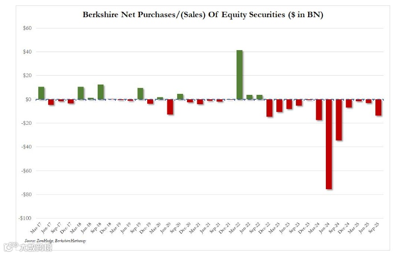 而这一数字的背后是公司的持续抛售。过去三年,伯克希尔已累计净卖出约1840亿美元的股票,仅在第三季度就再度抛售了价值61亿美元的普通股。