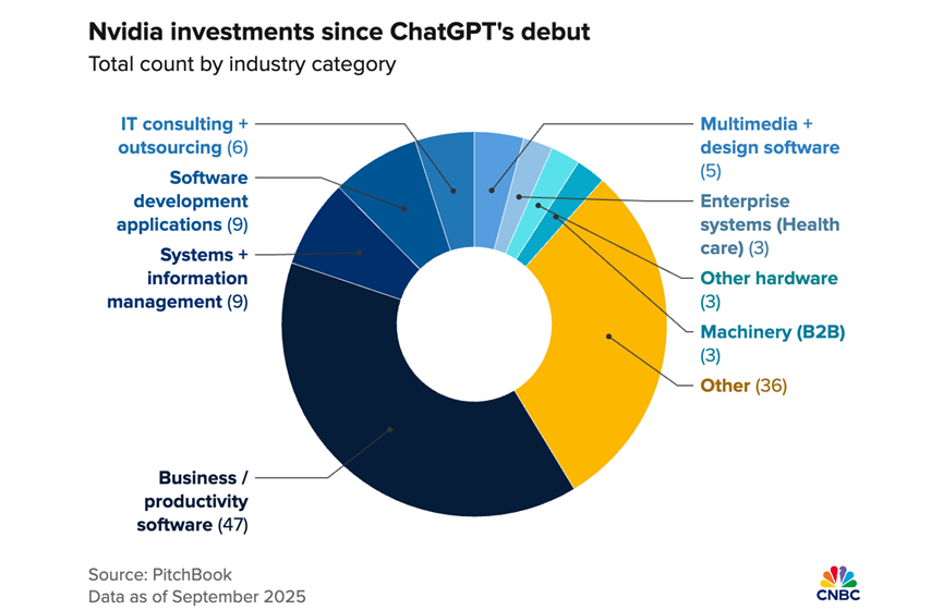 根据CNBC对PitchBook数据的分析,在ChatGPT首次亮相的那一年,英伟达对其他公司进行了16项投资,其中包括种子轮融资和通过孵化器获得的股份。英伟达的投资在2024年增加到41项,而截至2025年,该公司已完成了51项此类交易,其中不包括对OpenAI的承诺。