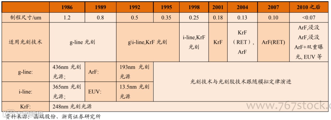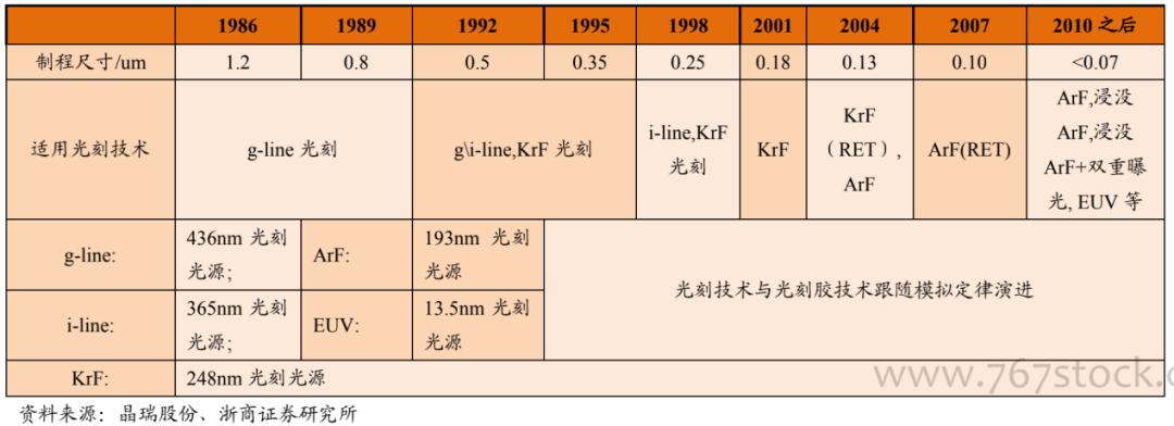 历史上光刻机所使用的光源波长呈现出与集成电路关键尺寸同步缩小的趋势。不同波长的光刻光源要求截然不同的光刻设备和光刻胶材料。在20世纪80年代,半导体制成的主流工艺尺寸在1.2um(1200nm)至 0.8um(800nm)之间。那时候波长436nm的光刻光源被广泛使用。在90年代前半期,随着半导体制程工艺尺寸朝 0.5um(500nm)和0.35um(350nm)演进,光刻开始采用365nm波长光源。
