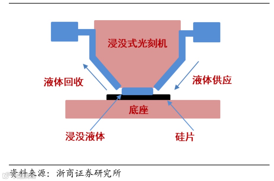 浸没光刻;在与浸没光刻相对的干法光刻中,光刻透镜与光刻胶之间是空气。光刻胶直接吸收光源发出的紫外辐射并发生光化学反应。在浸没光刻中,光刻镜头与光刻胶之间是特定液体。这些液体可以是纯水也可以是别的化合物液体。光刻光源发出的辐射经过这些液体的时候发生了折射,波长变短。这样,在不改变光源的前提条件下,更短波长的紫外光被投影光刻胶上,提高了光刻加工的分辨率。下图左展示了一个典型的浸没光刻系统。