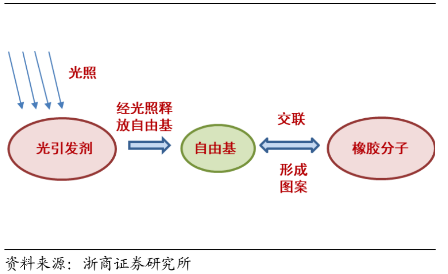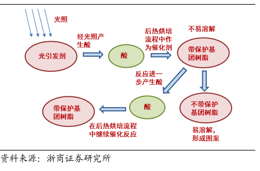 在CAR技术体系中,光刻胶中的光引发剂经过曝光后并不直接改变光刻胶在显影液中的溶解度,而是产生酸。在后续的热烘培流程的高温环境下,曝光产生的酸作为催化剂改变光刻胶在显影液中的溶解度。因此CAR技术体系下的光引发剂又叫做光致酸剂。