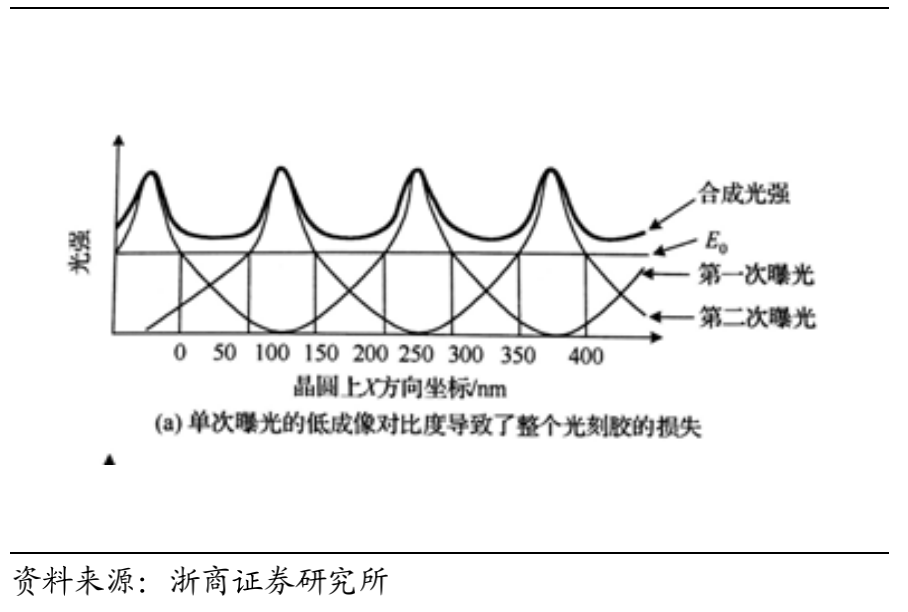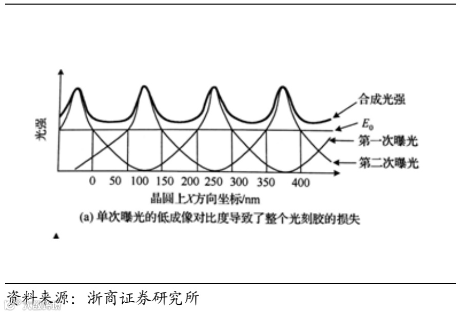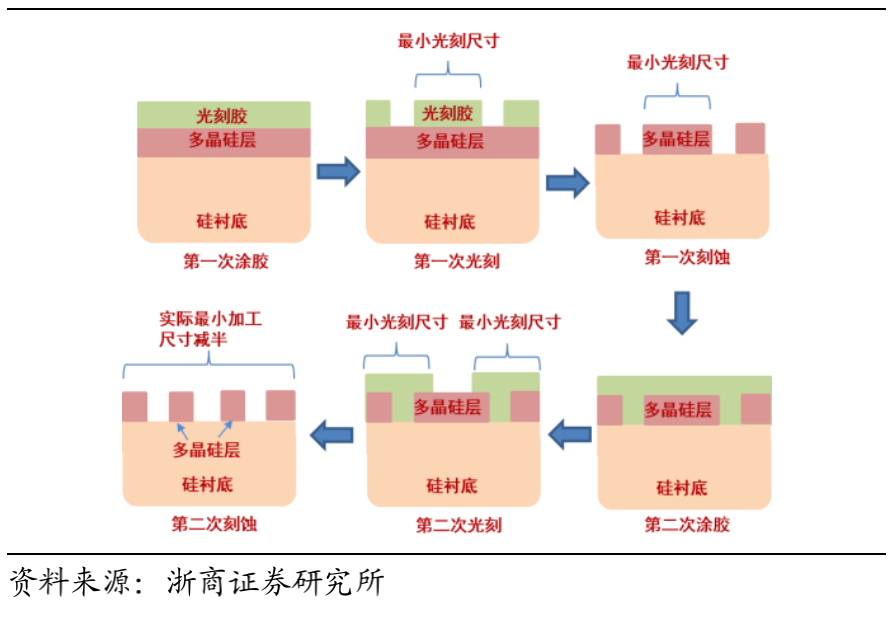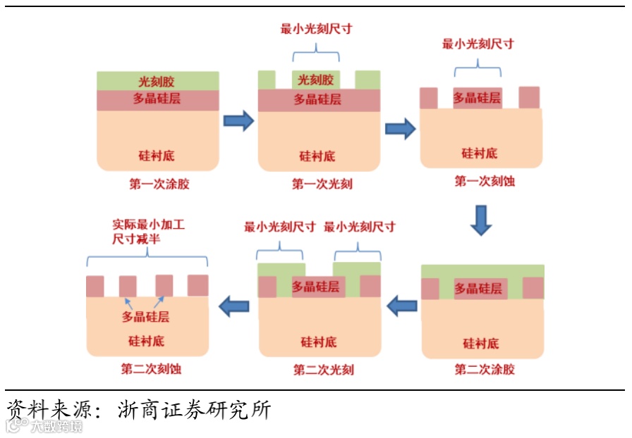 双重光刻;双重光刻的意思是通过两次光刻使得加工分辨率翻倍。实现这个目的的一种方法是在第一次光刻过后平移同一个光罩进行第二次光刻,以提高加工分辨率。下图右展示了这样一个过程。下图右中双重光刻子进行了两次涂胶,两次光刻和两次刻蚀。随着光刻胶技术的进步,仅需要一次涂胶,两次光刻和一次刻蚀的双重光刻工艺也成为可能。