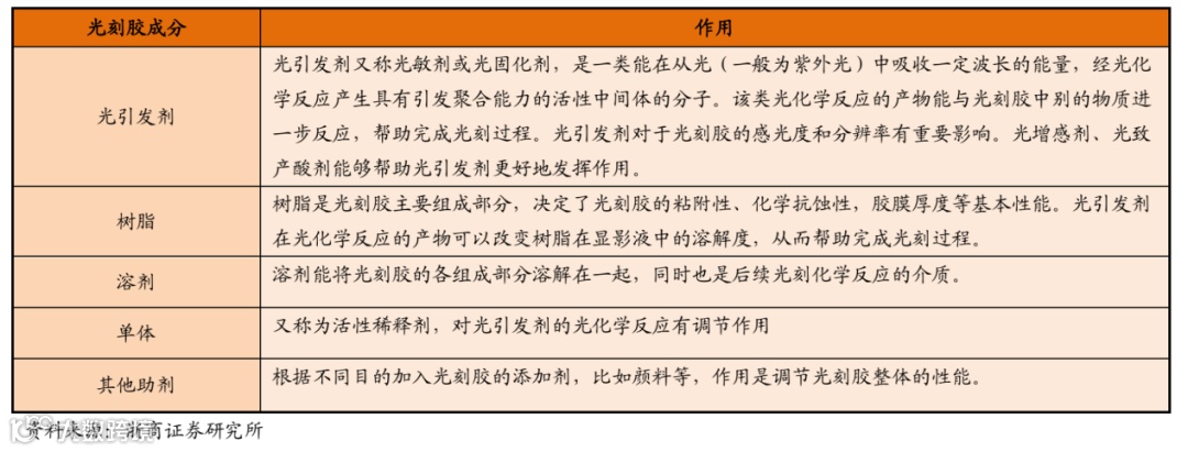 光刻胶的技术壁垒包括配方技术,质量控制技术和原材料技术。配方技术是光刻胶实现功能的核心,质量控制技术能够保证光刻胶性能的稳定性而高品质的原材料则是光刻胶性能的基础。