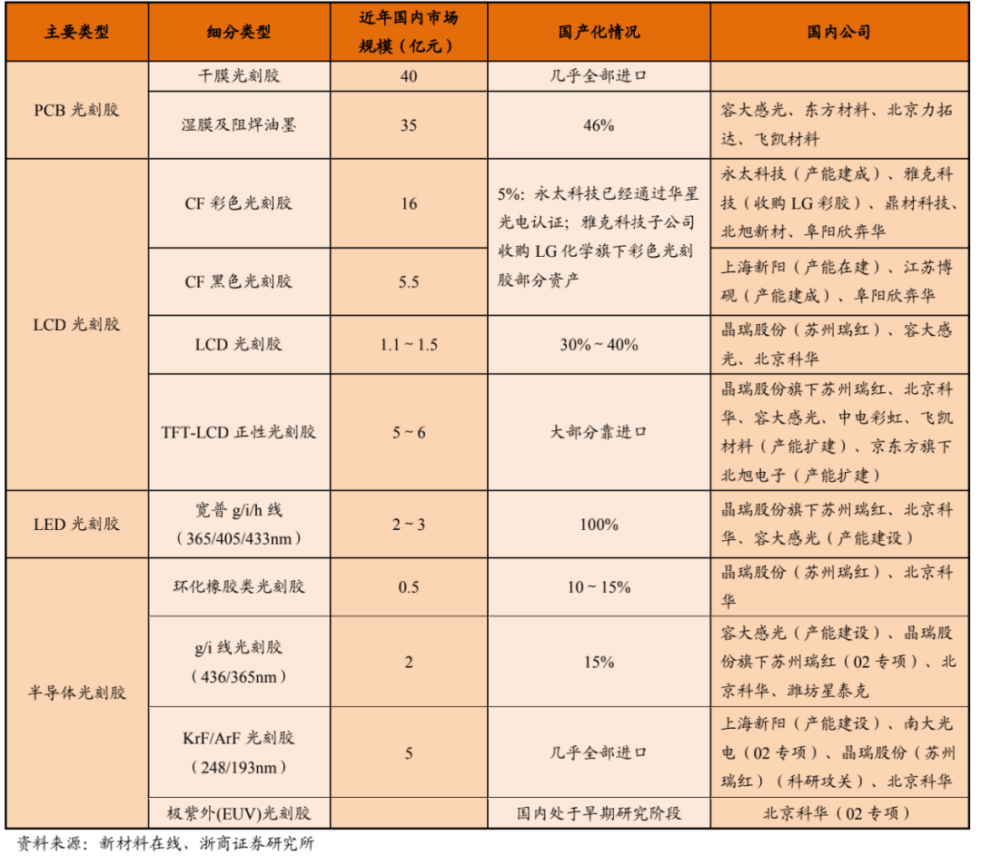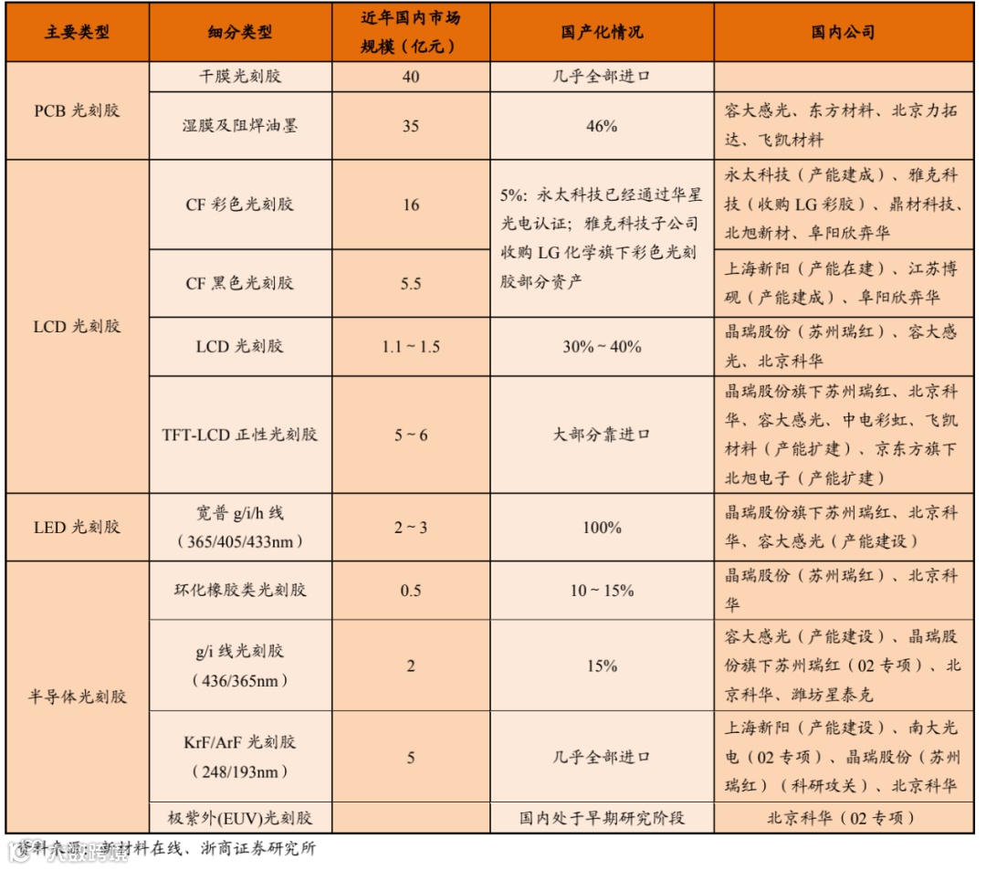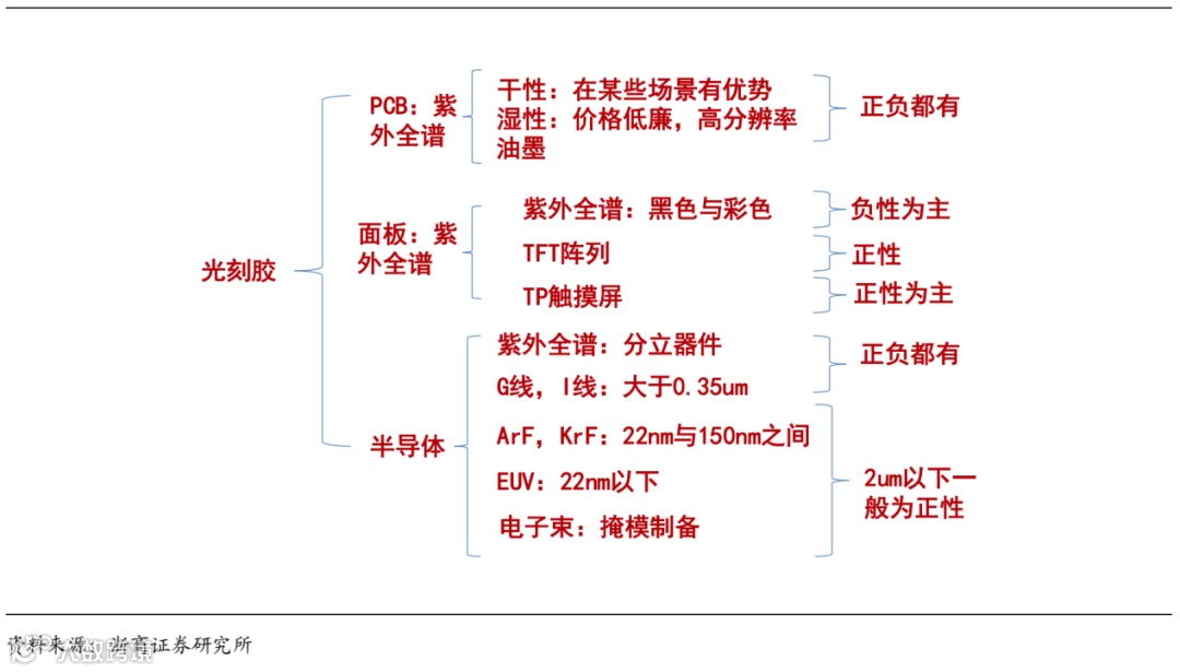 在PCB行业;主要使用的光刻胶有干膜光刻胶、湿膜光刻胶、感光阻焊油墨等。干膜是用特殊的薄膜贴在处理后的敷铜板上,进行曝光显影;湿膜和光成像阻焊油墨则是涂布在敷铜板上,待其干燥后进行曝光显影。干膜与湿膜各有优势,总体来说湿膜光刻胶分辨率高于干膜,价格更低廉,正在对干膜光刻胶的部分市场进行替代。