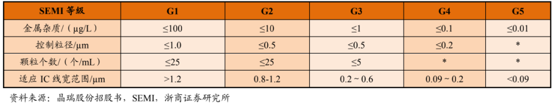 原材料技术:光刻胶是一种经过严格设计的复杂、精密的配方产品,由成膜剂、光敏剂、溶剂和添加剂等不同性质的原料,通过不同的排列组合,经过复杂、精密的加工工艺而制成。因此,光刻胶原材料的品质对光刻胶的质量起着关键作用。对于半导体化学化学试剂的纯度,际半导体设备和材料组织(SEMI)制定了国际统一标准,如下表中所示。