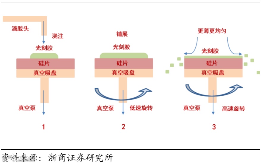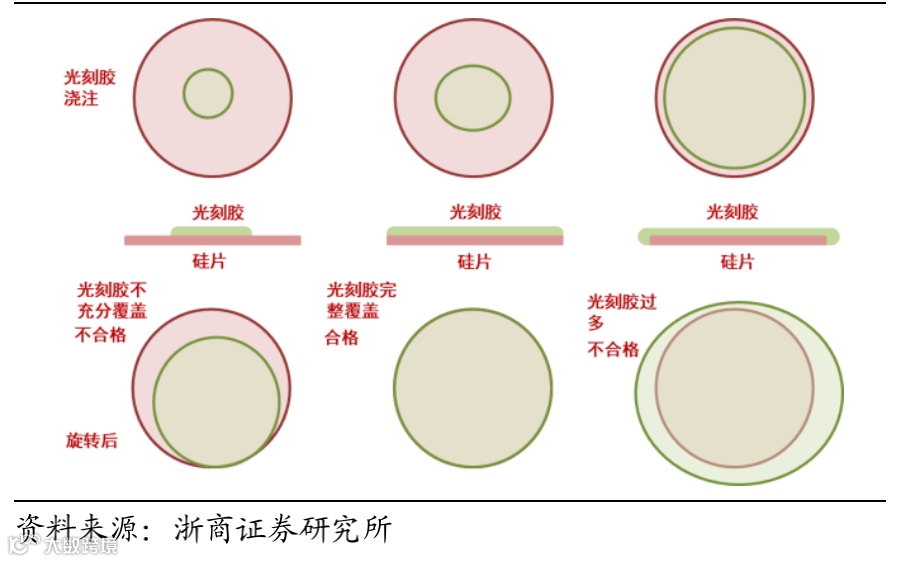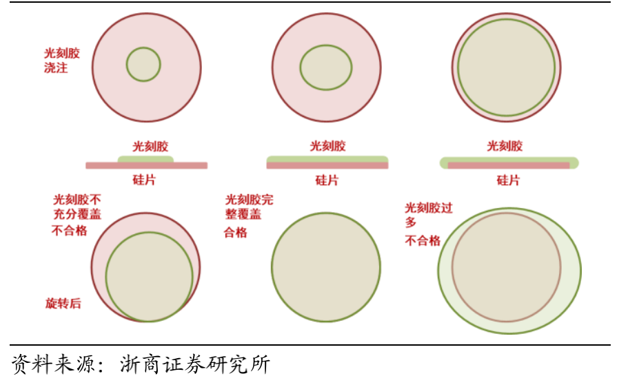 静态旋转法:首先把光刻胶通过滴胶头堆积在硅片的中心,然后低速旋转使得光刻胶铺开,再以高速旋转甩掉多余的光刻胶。在高速旋转的过程中,光刻胶中的溶剂会挥发一部分。这个过程可以如图表16中所示。静态涂胶法中的光刻胶堆积量非常关键,量少了会导致光刻胶不能充分覆盖硅片,量大了会导致光刻胶在硅片边缘堆积甚至流到硅片的背面,影响工艺质量。