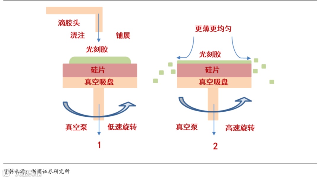上图步骤1中的光刻胶涂胶过程也是一种重要的半导体工艺。其目的就是在晶圆表面建立轻薄,均匀且没有缺陷的光刻胶膜。一般来说,光刻胶膜厚度从0.5um到1.5um 不等,厚度的误差需要在正负0.01um以内。半导体光刻胶的涂敷方法主要是旋转涂胶法,具体可以分为静态旋转法和动态喷洒法。