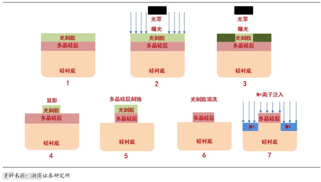 于是,光罩(掩模版)上的图形就被转移到了多晶硅材料上,完成了“光刻”的过程。在此后的步骤5到步骤7里,基于“光刻”过程在多晶硅材料上留下的光刻胶图形,“多晶硅层刻蚀”、“光刻胶清洗”和“N+离子注入”工艺共同完成了一个NMOS 三极管的构造。