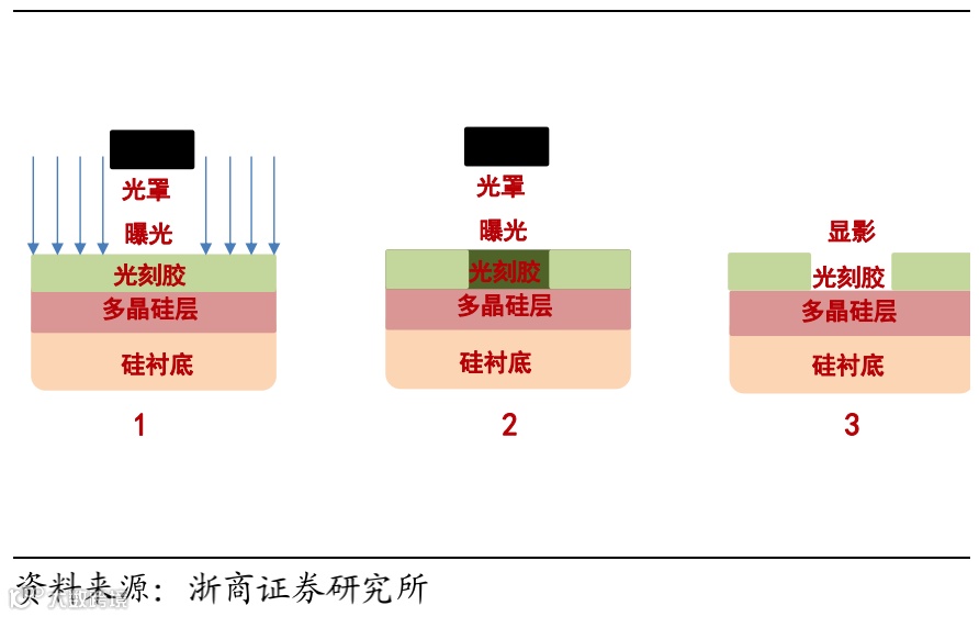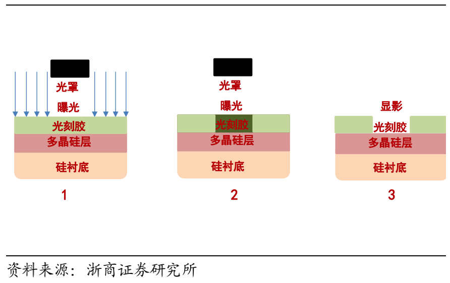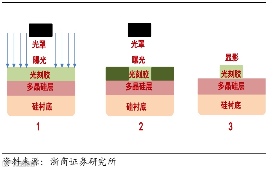 在这样一个典型例子中,步骤1中的绿色部分代表红色部分多晶硅材料被涂上了一层光刻胶。在步骤2的光刻曝光过程中,黑色的掩膜遮挡范围之外的光刻胶被都被光刻光源照射,发生了化学性质的改变,在步骤3中表现为变成了墨绿色。在步骤4里,经过显影之后,红色表征的多晶硅材料上方只有之前被光罩遮挡的地方留下了光刻胶材料。