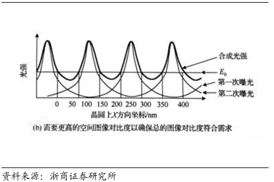 在双重曝光工艺中,若光刻胶可以接受多次光刻曝光而不在光罩遮挡的区域发生光化学反应,就可以节省一次刻蚀,一次涂胶和一次光刻胶清洗流程。下图左展示了一次不合格的双重曝光过程。由于在非曝光区域光刻胶仍然会接受到相对少量的光刻辐射,在两次曝光过程后,非曝光区域接受到的辐射有可能超过光刻胶的曝光阈值E0,而发生错误的光刻反应。在下图右中,非曝光区域的光刻胶在两次曝光后接受到的辐射能量仍然小于其曝光阈值E0,因此下图右是一次合格的双重曝光。从这个例子可以看出,与单次曝光不同,双重曝光要求光刻胶的曝光阈值和光刻光源的照射强度之间的权衡。