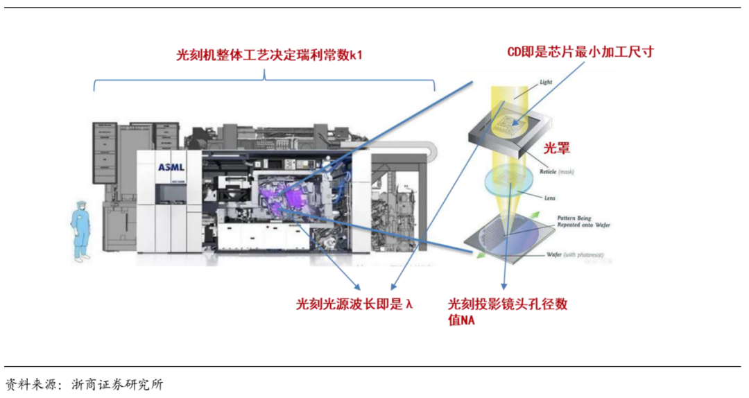 CD (Critical Dimension)表示集成电路制程中的特征尺寸;k1是瑞利常数,是光刻系统中工艺和材料的一个相关系数;λ是曝光波长,而NA(Numerical Aperture)则代表了光刻机的孔径数值。因此,光刻机需要通过降低瑞利常数和曝光波长,增大孔径尺寸来制造具有更小特征尺寸的集成电路。其中降低曝光波长与光刻机使用的光源以及光刻胶材料高度相关。