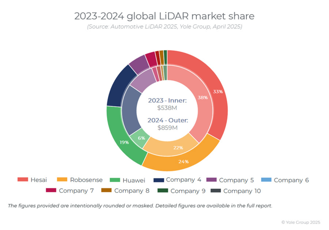 纵观乘用车市场,排名与去年相比发生了巨大变化。速腾聚创以 29% 的市场份额保持领先,其次是华为(24%)、禾赛科技和速腾聚创。这四家中国公司控制着 92% 的市场。