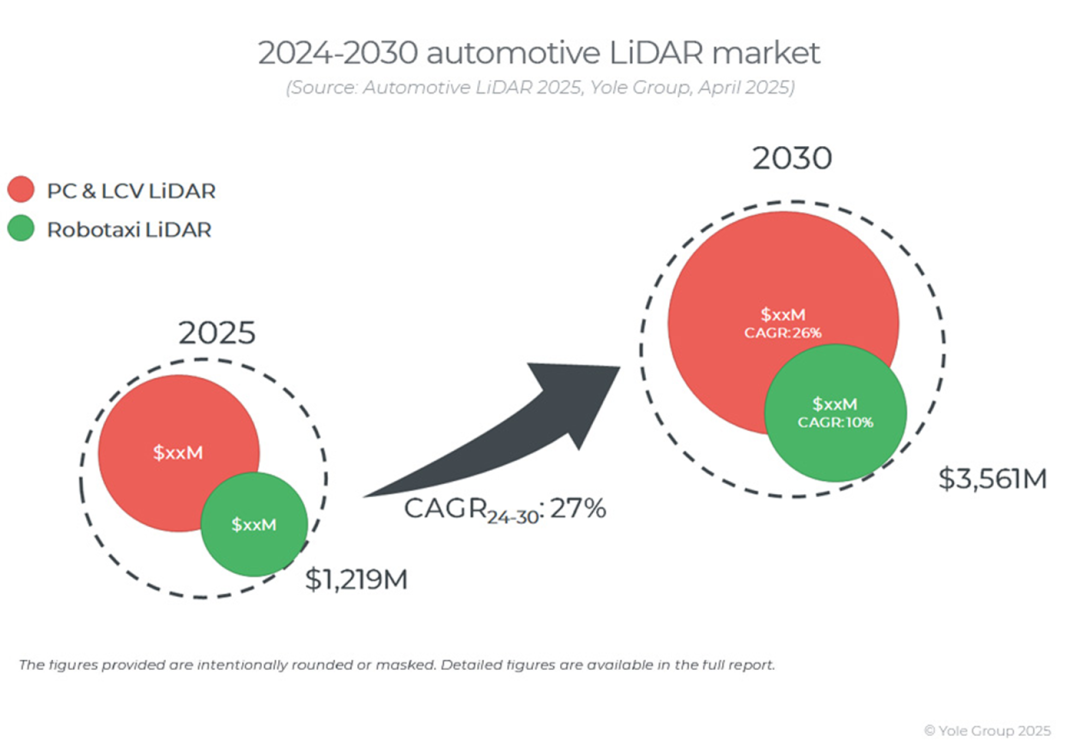 据知名分析机构Yole预测,全球汽车激光雷达市场预计将从 2024 年的 8.61 亿美元增长到 2030 年的 38.04 亿美元,2024 年至 2030 年期间的复合年增长率为 28%。2022 年,我们正处于 PC&LCV 与 Robotaxi 市场的十字路口,而到 2024 年,PC&LCV 的激光雷达市场将是 Robotaxi 的四倍多。