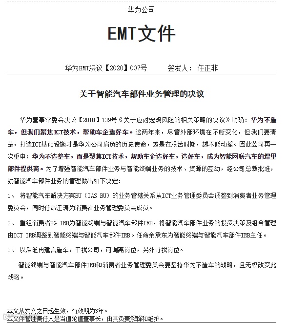 华为董事常委会决议【2018】139号《关于应对宏观风险的相关策略的决议》明确:华为不造车,但我们聚焦ICT技术,帮助车企造好车。这两年来,尽管外部环境在不断变化,但我们要清楚,打造 ICT 基础设施才是华为公司肩负的历史使命,越是在艰苦时期,越不能动摇。因此公司再一次重申:华为不造整车,而是聚焦 ICT 技术,帮助车企造好车,造好车,成为智能网联汽车的增量部件提供商。为了增强智能汽车部件业务与智能终端业务的技术、资源的互动,经公司总裁批准,就智能汽车部件业务的管理做出如下决定: