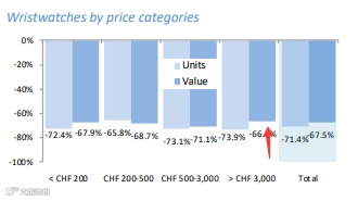 数据显示,5月份各类钟表出口额的下跌幅度都在66%-74%之间。其中,价位高于3000瑞士法郎(约2.2万人民币)的钟表出口下跌66.4%,下跌幅度最小。