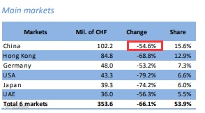 但在5月,瑞士钟表对中国内地市场出口额急剧下跌,下降幅度高达54.6%;对中国香港的出口更是暴跌68.8%。