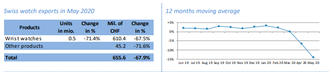 近日,根据瑞士钟表工业联合会(Federation of the Swiss Watch Industry FH)最新公布的统计数据显示,在4月出口大跌81.3%之后,5月瑞士钟表出口继续下滑,出口额同比下跌67.9%至6.556亿瑞士法郎(约50亿元人民币)。