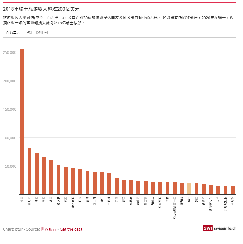 根据瑞士西部高等专业学院(HES-SO)进行的一项研究,占瑞士国内生产总值2.9%的旅游业或将在2020年内遭受高达87亿瑞郎(约合人民币645亿元)的损失,近四分之一的旅游企业面临破产的风险。