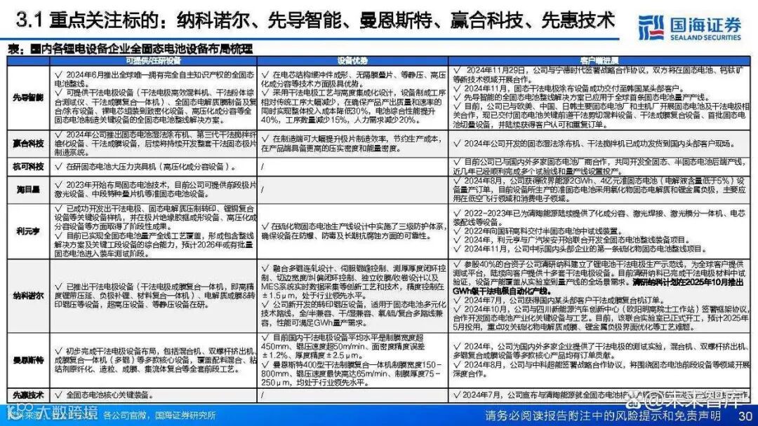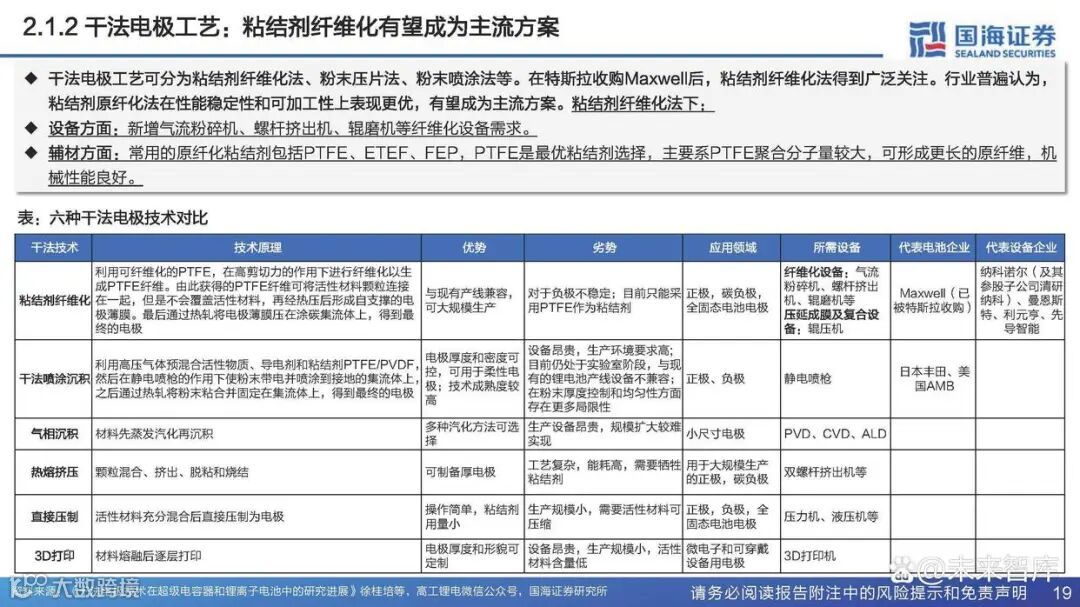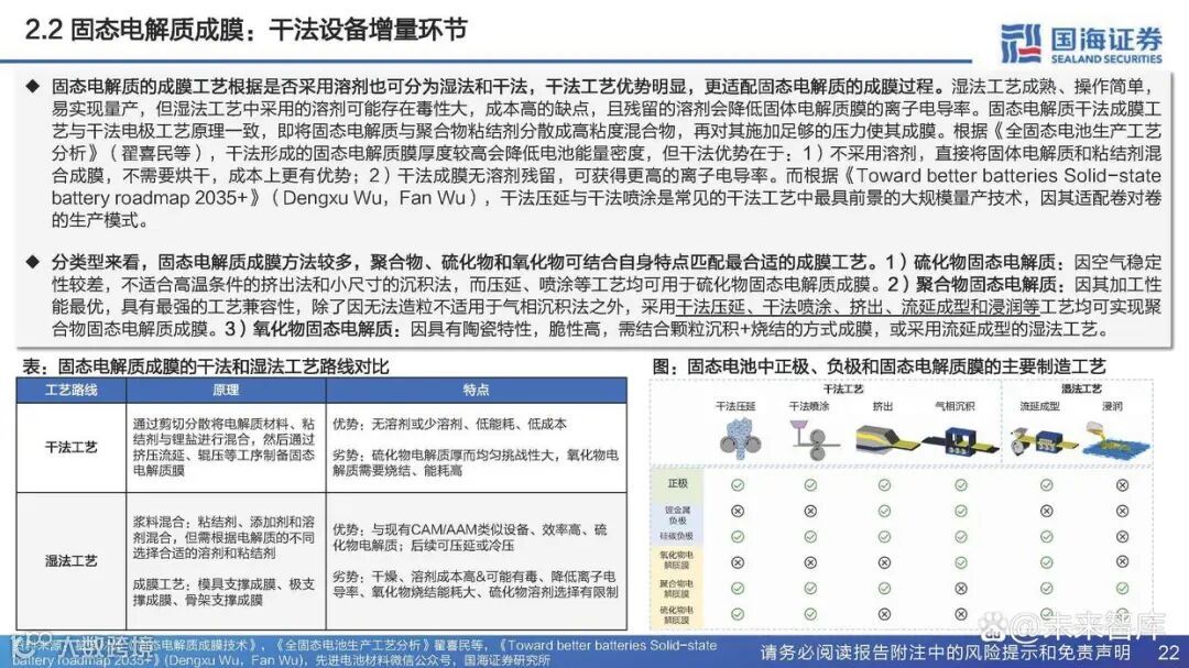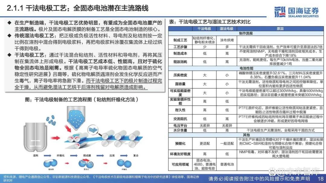 在生产制造端,干法电极工艺优势明显,有望成为全固态电池量产的 主流路线。极片及固态电解质膜的制备工艺是全固态电池制造的核心。