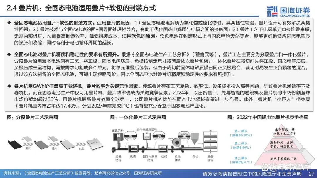 全固态电池对叠片机精度和稳定性的要求有所提升。根据《全固态电池生产工艺分析》(翟喜民等),叠片工艺主要分为分段叠片和一体化叠片。分段叠片沿用液态电池原有工艺,将正极、固态电解质层、负极按制定尺寸裁剪后依次叠片包装;一体化叠片在裁切前先将正极、固态电解质层、负极压成三层结构,再按需求切割成多个单元,将单元堆叠后包装。但由于裁切前固体电解质膜已同正负极贴合,裁切时易发生正负颗粒的混合,通过该方法制备的全固态电池,可能出现短路风险。因此全固态电池对叠片机精度和稳定性的要求有所提升。