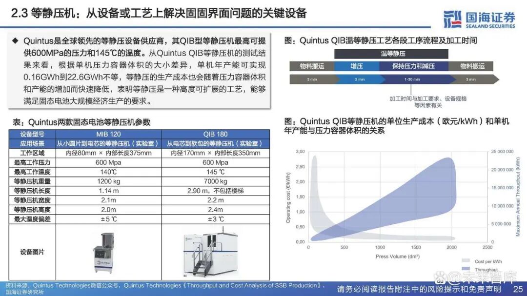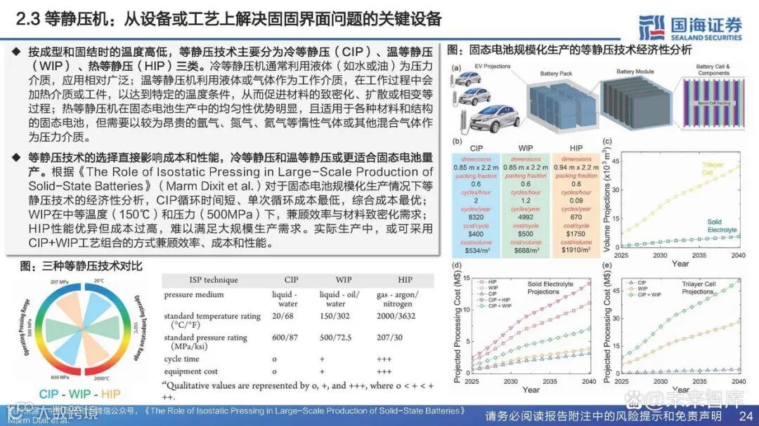 等静压技术的选择直接影响成本和性能,冷等静压和温等静压或更适合固态电池量 产。根据《The Role of Isostatic Pressing in Large-Scale Production of Solid-State Batteries》(Marm Dixit et al.)对于固态电池规模化生产情况下等 静压技术的经济性分析,CIP循环时间短、单次循环成本最低,综合成本最优;WIP在中等温度(150℃)和压力(500MPa)下,兼顾效率与材料致密化需求;HIP性能优异但成本过高,难以满足大规模生产需求。实际生产中,或可采用 CIP+WIP工艺组合的方式兼顾效率、成本和性能。