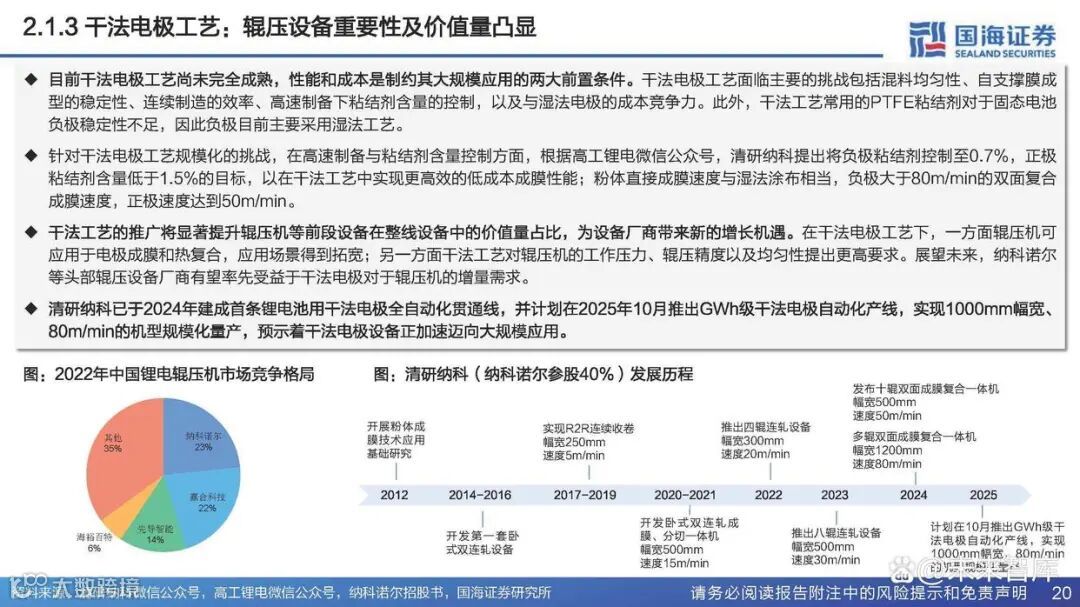 干法工艺的推广将显著提升辊压机等前段设备在整线设备中的价值量占比,为设备厂商带来新的增长机遇。在干法电极工艺下,一方面辊压机可应用于电极成膜和热复合,应用场景得到拓宽;另一方面干法工艺对辊压机的工作压力、辊压精度以及均匀性提出更高要求。展望未来,纳科诺尔等头部辊压设备厂商有望率先受益于干法电极对于辊压机的增量需求。