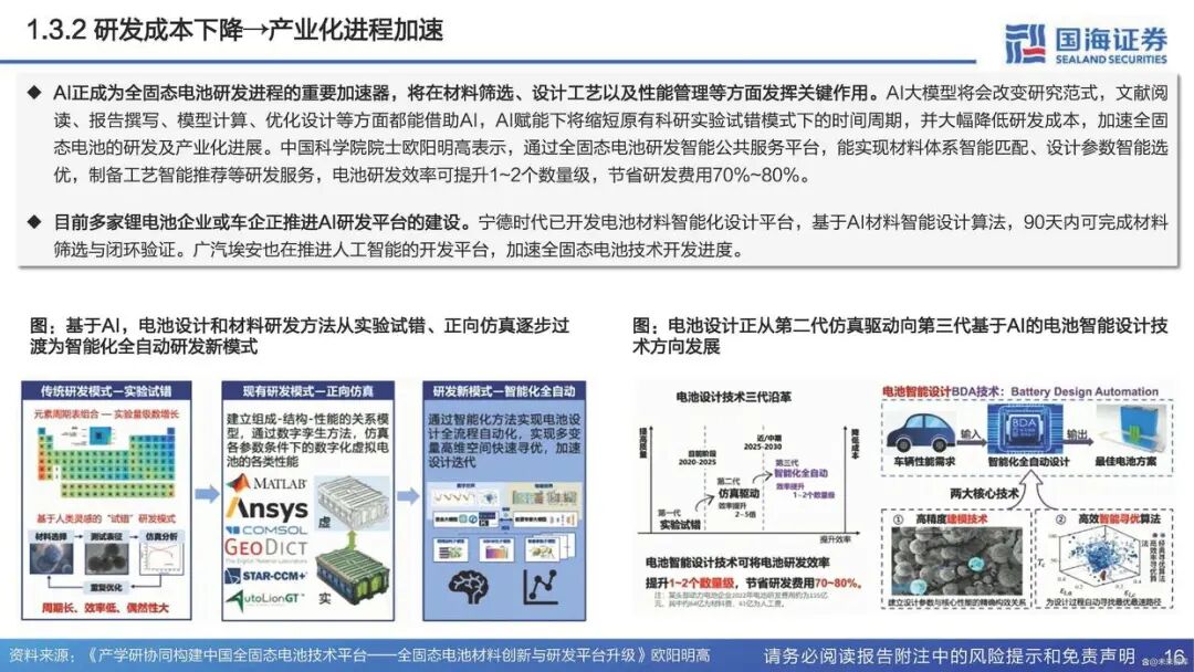 AI正成为全固态电池研发进程的重要加速器,将在材料筛选、设计工艺以及性能管理等方面发挥关键作用。AI大模型将会改变研究范式,文献阅读、报告撰写、模型计算、优化设计等方面都能借助AI,AI赋能下将缩短原有科研实验试错模式下的时间周期,并大幅降低研发成本,加速全固态电池的研发及产业化进展。中国科学院院士欧阳明高表示,通过全固态电池研发智能公共服务平台,能实现材料体系智能匹配、设计参数智能选优,制备工艺智能推荐等研发服务,电池研发效率可提升1~2个数量级,节省研发费用70%~80%。