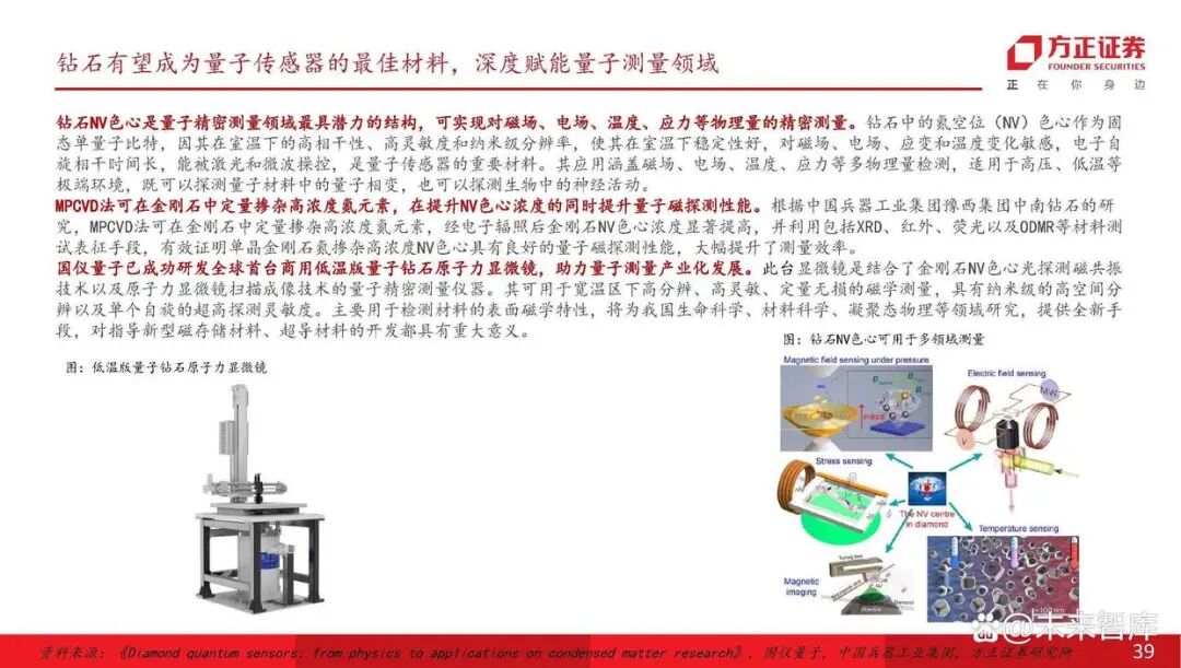 钻石NV色心是量子精密测量领域最具潜力的结构,可实现对磁场、电场、温度、应力等物理量的精密测量。钻石中的氮空位(NV)色心作为固 态单量子比特,因其在室温下的高相干性、高灵敏度和纳米级分辨率,使其在室温下稳定性好,对磁场、电场、应变和温度变化敏感,电子自 旋相干时间长,能被激光和微波操控,是量子传感器的重要材料。其应用涵盖磁场、电场、温度、应力等多物理量检测,适用于高压、低温等 极端环境,既可以探测量子材料中的量子相变,也可以探测生物中的神经活动。MPCVD法可在金刚石中定量掺杂高浓度氮元素,在提升NV色心浓度的同时提升量子磁探测性能。根据中国兵器工业集团豫西集团中南钻石的研 究,MPCVD法可在金刚石中定量掺杂高浓度氮元素,经电子辐照后金刚石NV色心浓度显著提高,并利用包括XRD、红外、荧光以及ODMR等材料测 试表征手段,有效证明单晶金刚石氮掺杂高浓度NV色心具有良好的量子磁探测性能,大幅提升了测量效率。国仪量子已成功研发全球首台商用低温版量子钻石原子力显微镜,助力量子测量产业化发展。此台显微镜是结合了金刚石NV色心光探测磁共振 技术以及原子力显微镜扫描成像技术的量子精密测量仪器。其可用于宽温区下高分辨、高灵敏、定量无损的磁学测量,具有纳米级的高空间分 辨以及单个自旋的超高探测灵敏度。主要用于检测材料的表面磁学特性,将为我国生命科学、材料科学、凝聚态物理等领域研究,提供全新手 段,对指导新型磁存储材料、超导材料的开发都具有重大意义。