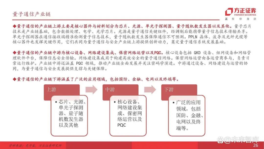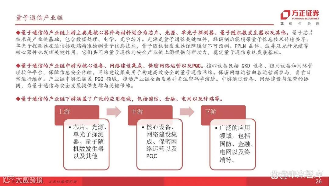 量子通信的产业链上游主要是核心器件与材料划分为芯片、光源、单光子探测器、量子随机数发生器以及其他。量子芯片 技术是产业链基础,包含数据处理、电学、光学芯片。光源是量子通信关键组件,经调制后能携带量子信息技术传输共享。单光子探测器在通信接收端精准检测量子信息技术,量子随机数发生器保障通信不可预测。PPLN 晶体、波导及光纤光缆等 核心器件也发挥关键作用,它们共同为量子通信与安全产业链上游提供创新动力,奠定量子通信系统发展基础。量子通信的产业链中游为核心设备、网络建设集成、保密网络运营以及PQC。核心设备包括 QKD 设备、组网设备和网络管 理软件平台,保障信息安全传输。网络建设集成用于构建高效安全的量子通信网络。保密网络运营由各运营商参与,负责日 常运行维护。产业链中游还涵盖 PQC 领域,推动产业链全面发展并关注密码学演进。中游通过设备、网络建设与运营的协 同,为量子通信与安全发展提供支撑与关键保障。量子通信的产业链下游涵盖了广泛的应用领域,包括国防、金融、电网以及终端等。