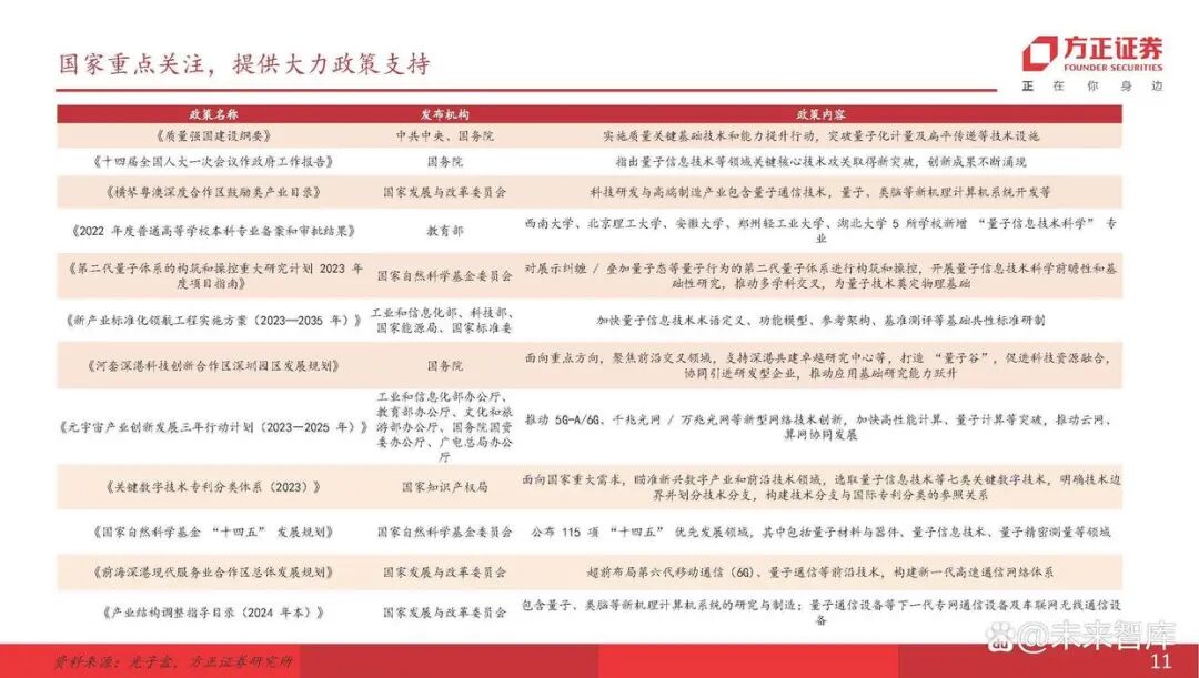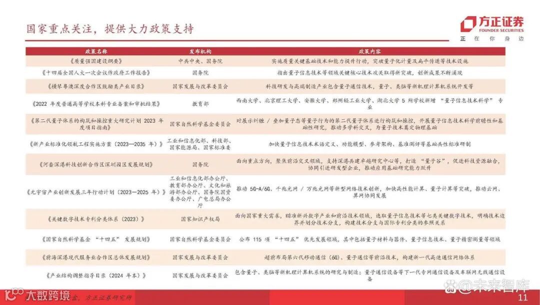 国内:目前,中央、东部沿海省市及部分中部16个省份均发布一系列相关政策,支持量子信息科技发展。2024年两会期间,国务院国资委指出,2025年中央企 业战略性新兴产业收入的占比要达35%,在类脑智能、量子信息、可控核聚变等方面要提前布局,到2030年要实现百万级量子计算机。2月20日,国内发布全 球首例基于集成光量子芯片的“连续变量”量子纠缠簇态,使量子计算距离实用化再近一步。国内研发的105个量子比特的“祖冲之三号”量子计算机正式发 表,为目前超导量子计算的最强优越性。我国第三代自主超导量子计算机“本源悟空”突破2000万次全球访问量。