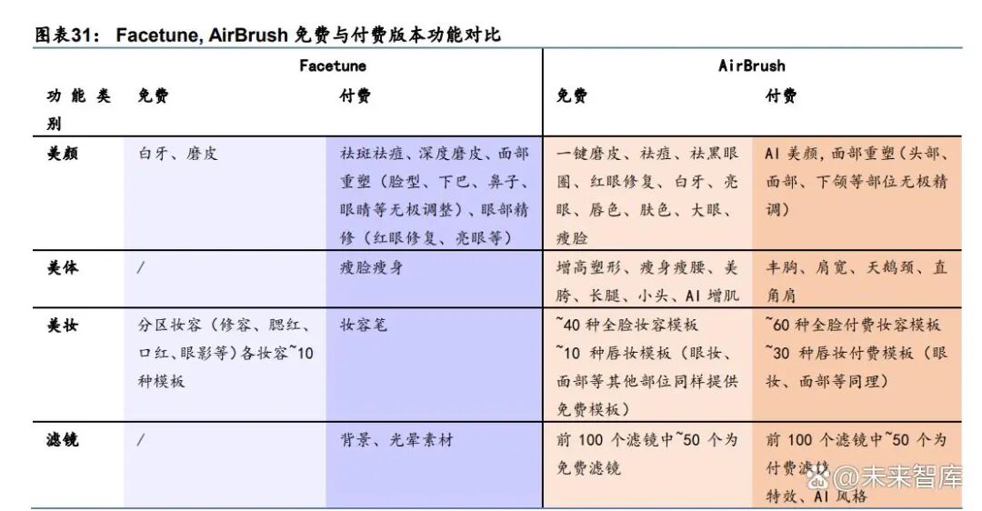 应用内付费墙设置影响用户订阅行为。对比 AirBrush 与 Facetune,AirBrush 额外提供 了美体、AI 滤镜与风格写真、更丰富的美妆选择、AI 视频等功能,但 Facetune 却有更 高的收入表现,一方面是 Facetune 早期在美国市场凭借营销宣传获得可观用户基数并 培养用户使用粘性,另一方面就来源于 Facetune 的付费墙设置。相比起 AirBrush 提供 免费的祛斑、去皱、亮眼、以及大量滤镜效果,Facetune 的免费可用功能更受限,除 了手动的黑眼圈消除和基础磨皮外几乎所有功能均需付费解锁,进一步推动活跃用户付 费转化。