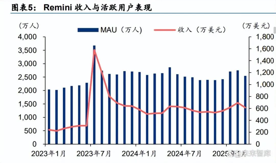 我们以推出AI 新功能对于应用的拉新与留存视角,进一步对比 AI 原生的单点应用与传统 生活场景应用。 单点突破的 AI 应用须有对应产品矩阵做流量承接,否则留存较困难。2022-2023 年期间, 海外以 Lensa 为代表、国内以妙鸭写真为代表的 AI 原生应用主打上传 10-20 张个人照片, 由 AI 技术生成一系列多种风格的头像或写真;2024 年,Remini 通过“黏土风”滤镜在国 内外引起迅速的社交媒体传播。但无论是 Lensa、妙鸭相机还是 Remini,虽然在上线时火 速爆红,但高潮褪去后均经历大规模用户流失。以妙鸭相机为例,上线首月用户峰值达 60 万,单日收入峰值达 55 万元,用户新鲜感消退后,2024 年日活下滑至 3.6 万,较峰值下 降 94%。Remini 在“黏土风”滤镜降温后又通过“老照片修复”寻找到第二成长曲线,但 在一波增长后也迎来了持续衰退。