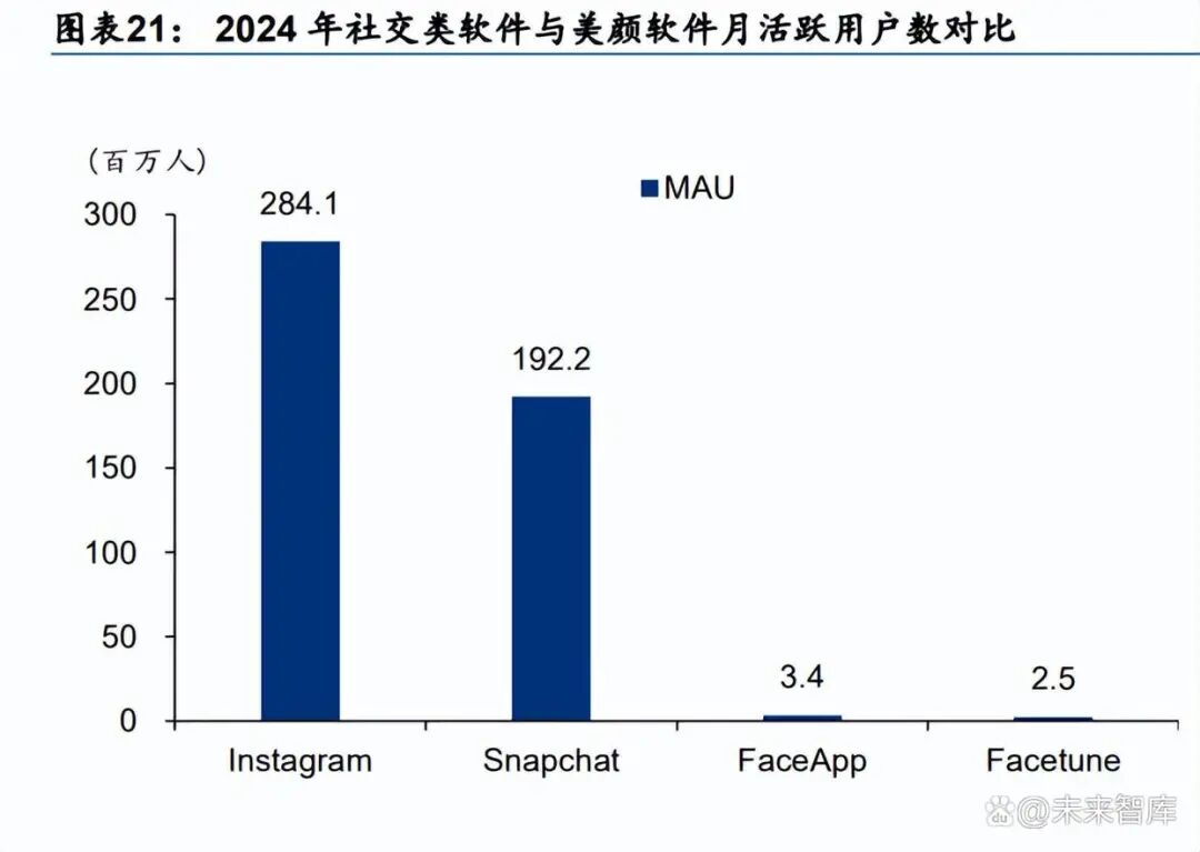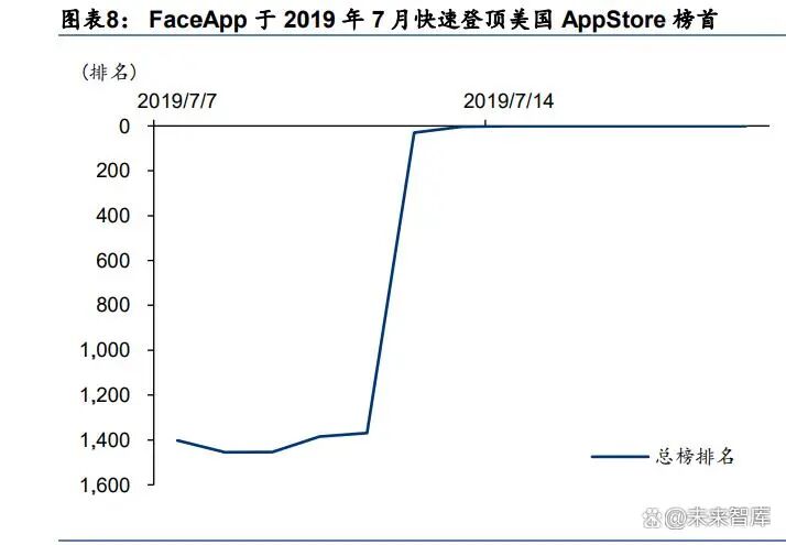 FaceApp 精准捕捉 UGC 内容背景下的社交媒体传播需求。2017 年,“俄国版 Google” Yandex 的前高管 Yaroslav 带领创业团队,基于深度神经网络技术(GAN)推出俄罗斯滤 镜应用 FaceApp。FaceApp 在俄罗斯上线初期瞄准移动互联网时代用户对趣味性、低门槛 图像娱乐化的需求,其背景是智能手机普及与社交平台(如 Instagram、VK)对 UGC(User Generated Context) 内容的高度依赖。上线当年特推出“笑容”滤镜,实现应用冷启动 与第一波用户积累;2018-2019 年通过“性别转化”与“变老”滤镜持续在社交媒体上迅 速传播,大量欧美明星加入滤镜挑战。巅峰时期 FaceApp 登顶 154 国 iOS 免费榜,活跃用 户近亿。