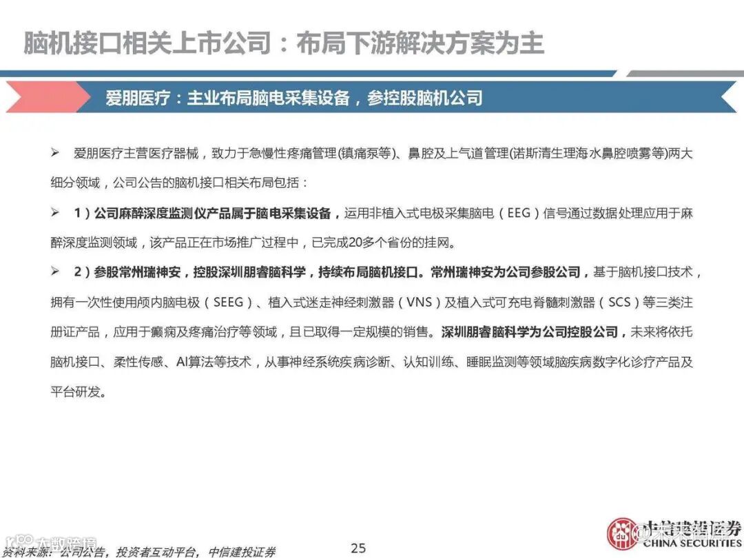 爱朋医疗主营医疗器械,致力于急慢性疼痛管理(镇痛泵等)、鼻腔及上气道管理(诺斯清生理海水鼻腔喷雾等)两大 细分领域,公司公告的脑机接口相关布局包括:1)公司麻醉深度监测仪产品属于脑电采集设备,运用非植入式电极采集脑电(EEG)信号通过数据处理应用于麻 醉深度监测领域,该产品正在市场推广过程中,已完成20多个省份的挂网。2)参股常州瑞神安,控股深圳朋睿脑科学,持续布局脑机接口。常州瑞神安为公司参股公司,基于脑机接口技术, 拥有一次性使用颅内脑电极(SEEG)、植入式迷走神经刺激器(VNS)及植入式可充电脊髓刺激器(SCS)等三类注 册证产品,应用于癫痫及疼痛治疗等领域,且已取得一定规模的销售。深圳朋睿脑科学为公司控股公司,未来将依托 脑机接口、柔性传感、AI算法等技术,从事神经系统疾病诊断、认知训练、睡眠监测等领域脑疾病数字化诊疗产品及 平台研发。