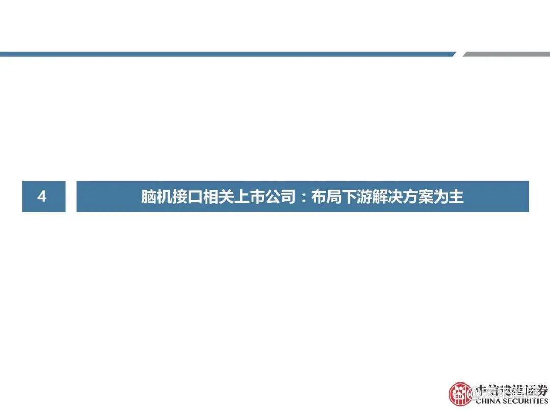 脑机接口系统根据硬件接入方式的不同,分为侵入式、半侵入式和非侵入式脑机接口。侵入式脑机接口:通过手术等方式将信号采集装置直接植入患者大脑皮层,以获得高强度、高质量的信号,但此种方式经济成本和安 全风险均较高,极有可能引发免疫反应和脑胶质细胞结痂等炎症反应,从而导致信号质量下降。Neuralink 2024年1月份公布的实验、 DBS技术属于侵入式脑机接口研究。半侵入式脑机接口:通过手术方式植入电极,但电极处于颅腔内硬膜外,半侵入式脑机接口相较于侵入式脑机接口,虽采集到的信号 较弱,但免疫反应和炎症反应发生率均较低,安全系数较高。清华大学与宣武医院的硬膜外电极临床研究,清华大学与天坛医院的无线微 创脑机接口临床试验都属于半侵入式脑机接口研究。非侵入式脑机接口:这种脑机接口无需手术,是对人体创伤最小、采集方法最为简单的脑电信号采集方式,将信号采集电极置于头皮 外部的非侵入式脑机接口,但电极与神经元距离较远,测得的信号噪声较大。非侵入式脑机接口主要用于诊疗康复领域,入耳式电子器件 及智能假肢等均属于这一类。