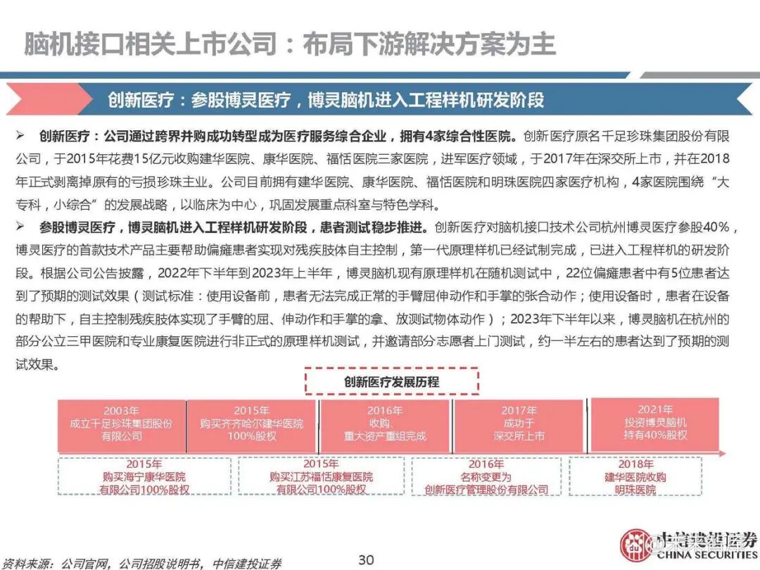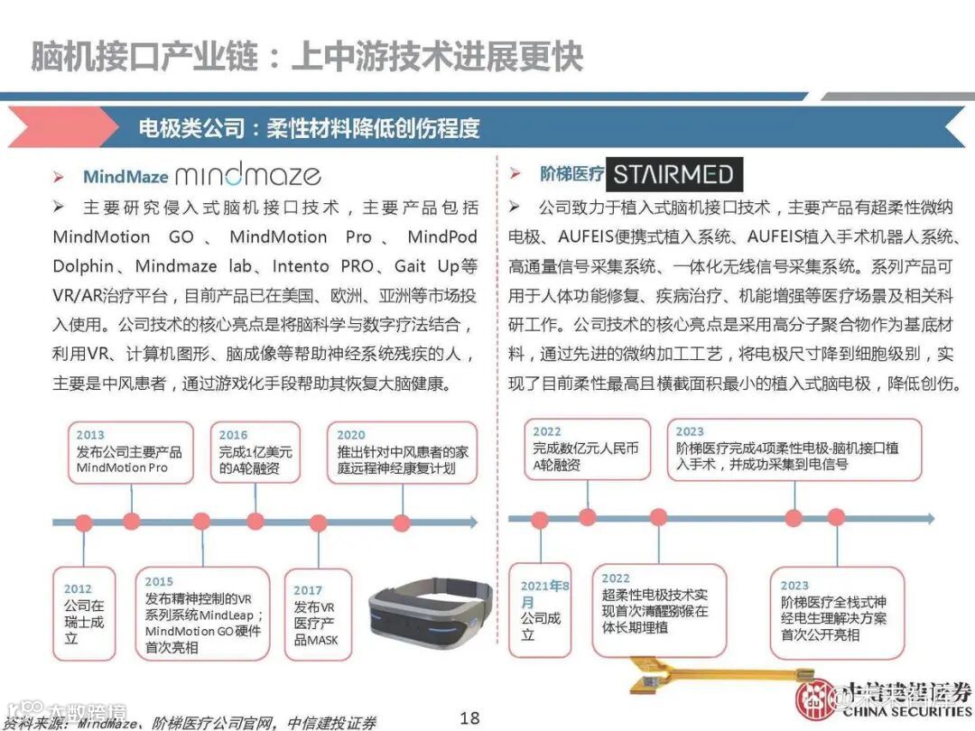 公司积极对外开展脑机接口合作研究。2024年6月4日,公司与武汉衷华脑机签署战略合作协议,双方将发挥各自在神经科学领域的专 业优势,在促进脑机接口临床转化等方向上开展合作。衷华脑机成立于2021年,具备从底层CMOS芯片设计、微机电系统工艺制备到脑机接 口系统总体设计的全链条自主可控的研发体系,已研制出6万5千通道双向植入式脑机接口系统。2)2024年4月27日,公司与清华大学生物 医学工程学院签署校企合作备忘录,双方将共建“脑机精准医学联合研究中心”,在脑疾病大数据、建模与计算和精准诊疗新技术等方面开 展研究,并推动临床转化,打造成为中国先进的脑疾病精准诊疗和脑健康技术创新联合研究中心。