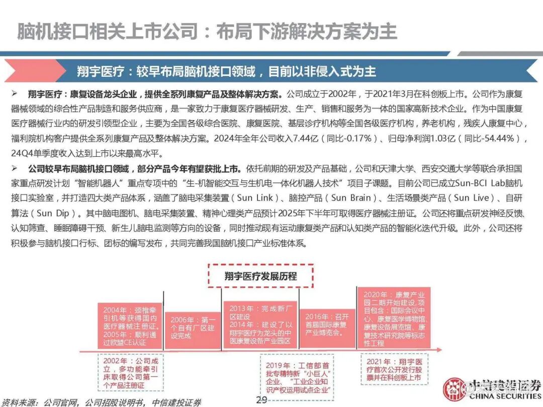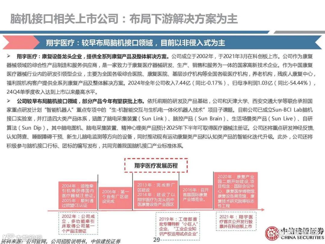公司依托子公司综合布局非侵入式和侵入式脑机接口。1)非侵入式方面,全资子公司龙之杰携手华南理工大学成功研发了经颅磁导航 系统及脑部的磁刺激治疗仪等产品,将脑机接口技术与现有康复产品进行融合,2024年7月10日,龙之杰发布三款基于脑机接口技术的神经 康复产品样机,包括脑机接口认知康复系统、脑机接口手功能康复系统以及脑机接口上下肢主被动康复系统。2)侵入式方面,2024年3月 28日,龙之杰在北京设立北京脑连科技有限公司,与清华大学高小榕教授等团队深入探索脑机接口相关技术。目前公司通过脑连科技与大兴 医药基地管委会联合成立“脑机接口植入式生物实验室”,专注于侵入式脑机接口技术的研发与转化。