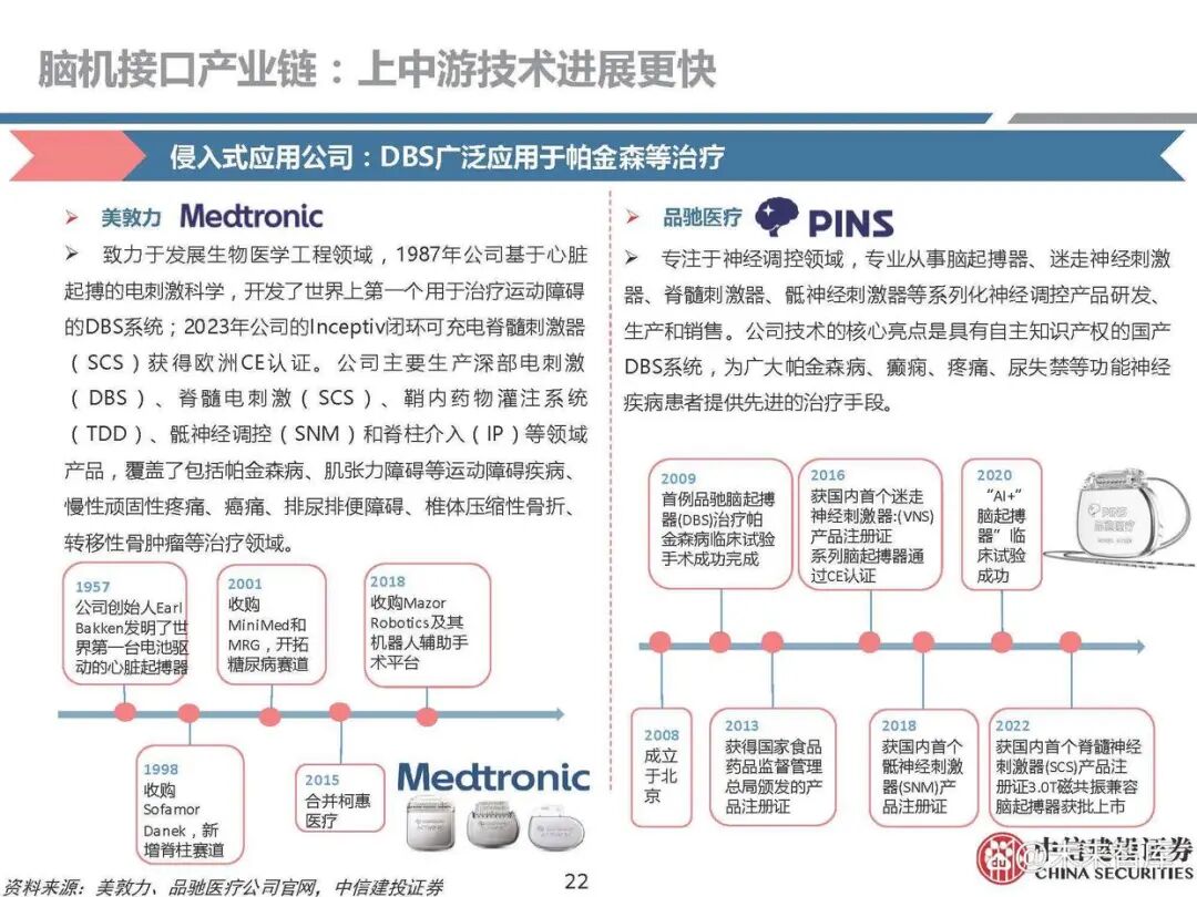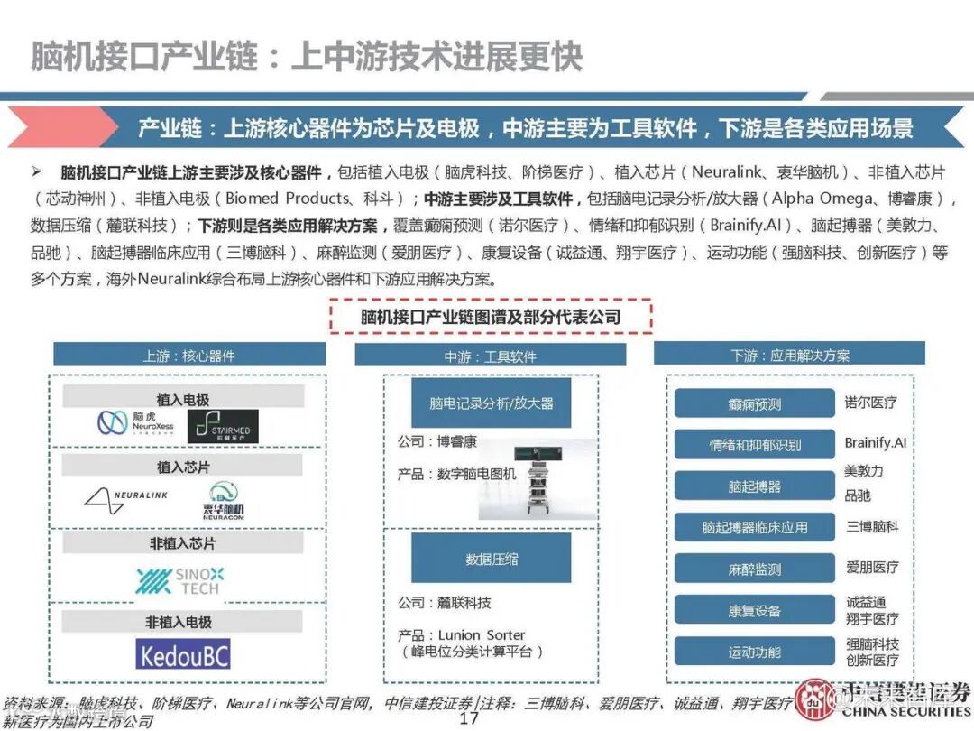 脑机接口产业链上游主要涉及核心器件,包括植入电极(脑虎科技、阶梯医疗)、植入芯片(Neuralink、衷华脑机)、非植入芯片 (芯动神州)、非植入电极(Biomed Products、科斗);中游主要涉及工具软件,包括脑电记录分析/放大器(Alpha Omega、博睿康), 数据压缩(麓联科技);下游则是各类应用解决方案,覆盖癫痫预测(诺尔医疗)、情绪和抑郁识别(Brainify.AI)、脑起搏器(美敦力、 品驰)、脑起搏器临床应用(三博脑科)、麻醉监测(爱朋医疗)、康复设备(诚益通、翔宇医疗)、运动功能(强脑科技、创新医疗)等 多个方案,海外Neuralink综合布局上游核心器件和下游应用解决方案。