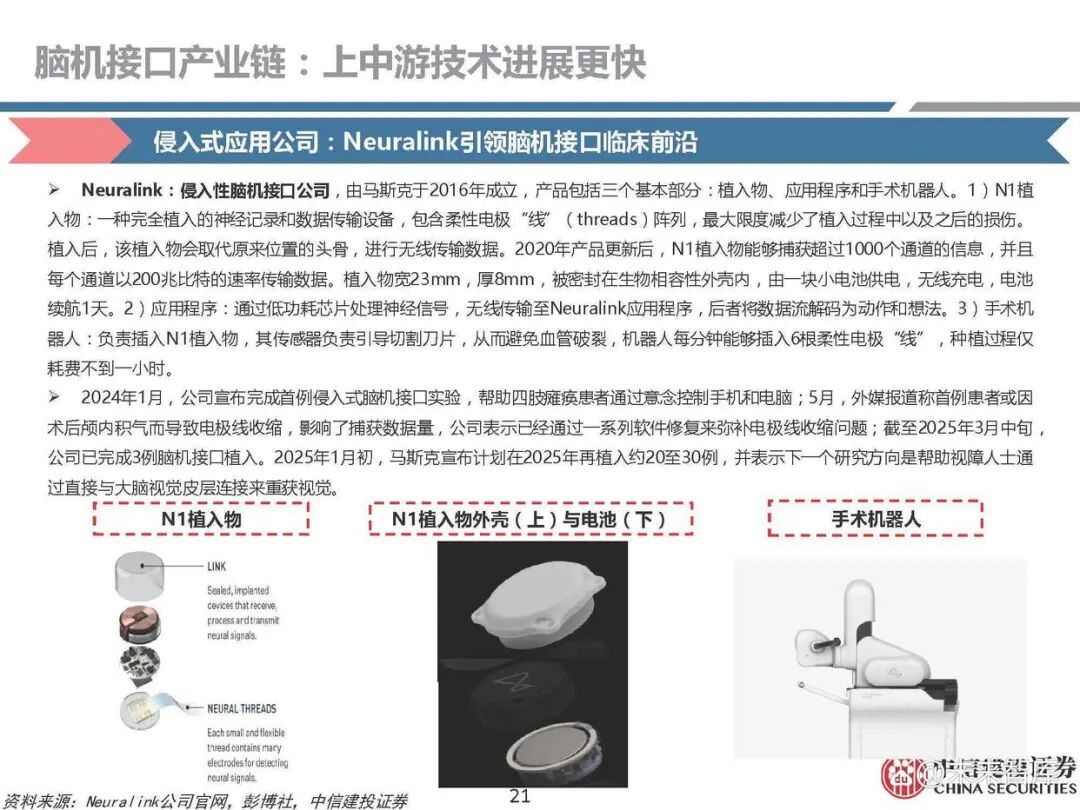 运动功能重建领域的侵入式与半侵入式临床试验越来越多,语言与视觉重建领域也有突破:1)Neuralink 2024年1月完成首例侵入式 脑机接口试验,帮助四肢瘫痪患者实现脑控手机和电脑;截至2025年3月中旬,公司已完成3例脑机接口植入;公司计划在2025年再植入约 20至30例,并表示下一个研究方向是帮助视障人士通过直接与大脑视觉皮层连接来重获视觉。2)2024年11月,博睿康与清华大学团队合 作完成全国第三例、上海第一例脑机接口植入手术,帮助因颈椎脊髓损伤而无法站立的患者下床坐轮椅。3)2024年12月,脑虎科技联合华 山医院,开展国内首例高通量植入式柔性脑机接口实时合成汉语言临床试验,通过对语言区占位肿瘤癫痫患者植入脑虎自研256导高通量脑 机接口电极,帮助其定位病灶并保护语言相关的重要脑功能区,术后七天实现142个常用汉语音节下71%的解码准确率,且单字解码时延小 于100毫秒。