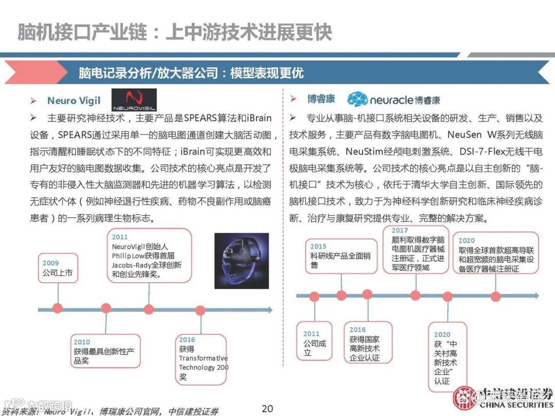 Neuralink:侵入性脑机接口公司,由马斯克于2016年成立,产品包括三个基本部分:植入物、应用程序和手术机器人。1)N1植 入物:一种完全植入的神经记录和数据传输设备,包含柔性电极“线”(threads)阵列,最大限度减少了植入过程中以及之后的损伤。植入后,该植入物会取代原来位置的头骨,进行无线传输数据。2020年产品更新后,N1植入物能够捕获超过1000个通道的信息,并且 每个通道以200兆比特的速率传输数据。植入物宽23mm,厚8mm,被密封在生物相容性外壳内,由一块小电池供电,无线充电,电池 续航1天。2)应用程序:通过低功耗芯片处理神经信号,无线传输至Neuralink应用程序,后者将数据流解码为动作和想法。3)手术机 器人:负责插入N1植入物,其传感器负责引导切割刀片,从而避免血管破裂,机器人每分钟能够插入6根柔性电极“线”,种植过程仅 耗费不到一小时。
