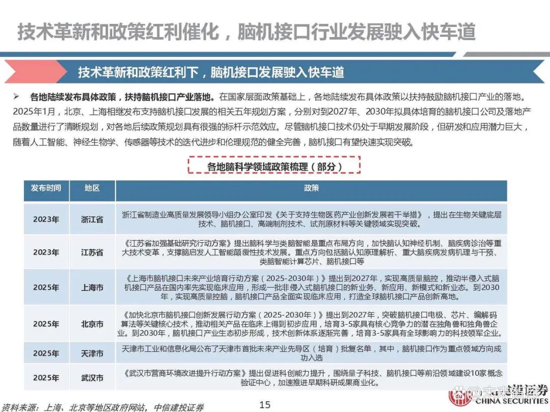 国家层面脑科学领域政策频出,不断完善顶层设计。我国“十四五”规划已将“脑科学与类脑研究”列为国家重点前沿科技项目,即提 出“中国脑计划”。今年以来,国家工信部、科技部、药监局、医保局等牵头,频频推出鼓励发展脑机接口技术、建立行业标准、加速临床 应用等多方面政策。2025年1月,国家药监局发布《采用脑机接口技术的医疗器械用于人工智能算法的脑电数据集质量要求与评价方法》, 从标准及监管层面推动脑机接口技术发展。2025年3月,国家医保局发布《神经系统类医疗服务价格项目立项指南(试行)》,其中专门为 脑机接口新技术前瞻性单独立项,设立了“侵入式脑机接口置入费”“侵入式脑机接口取出费”“非侵入式脑机接口适配费”等价格项目。