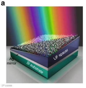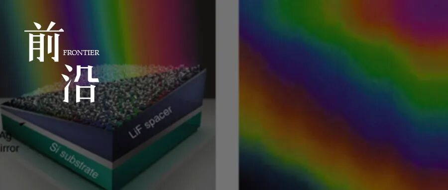 这一结构中有个最重要的部分,即被称为 LiF spacer 的透明腔体。由氟化锂之间的空隙形成的透明腔体不会耗散光,光子在其中以不同的频率共振,根据不同波长释放出各种颜色。